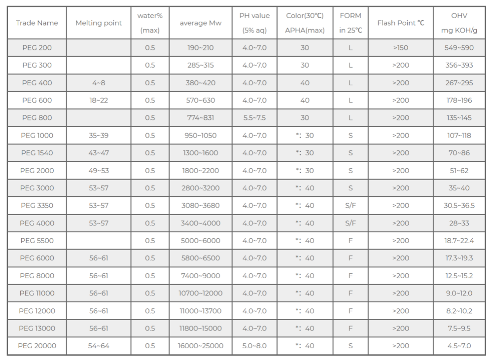PEG-1000 go PEG-4000: Meáchan móilíneach meánach, solaid waxy. De réir mar a mhéadaíonn an meáchan móilíneach, déan an slaodacht agus an leáphointe freisin. Mar shampla, is bonn suppository agus ointment a úsáidtear go coitianta i gcógaisíocht é PEG-3350, a thairgeann dea-fhoirmiúlacht agus feidhmíocht scaoileadh drugaí.